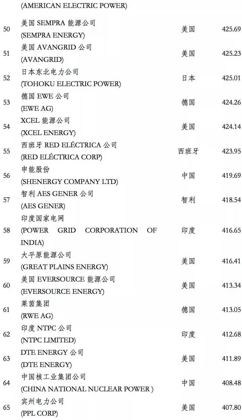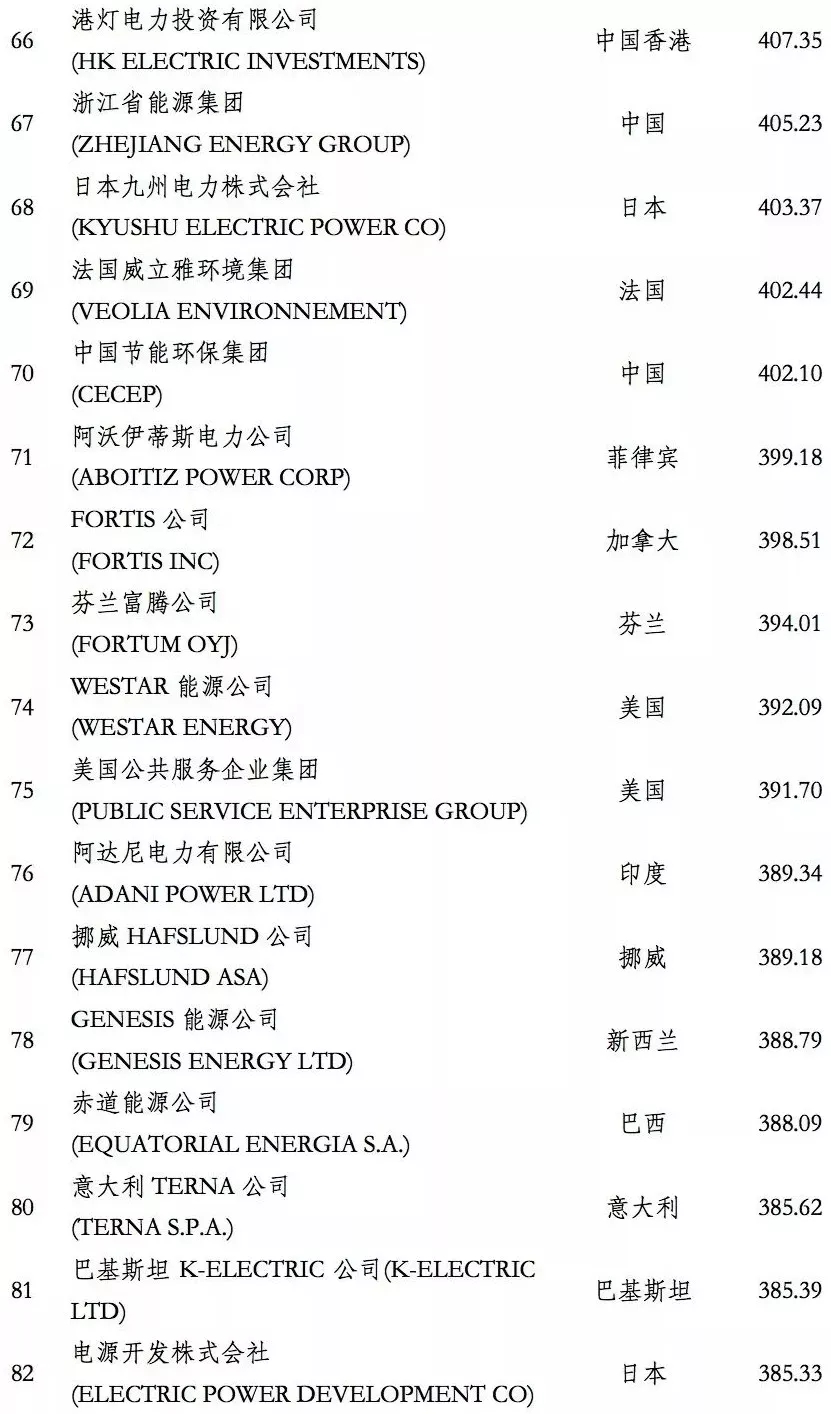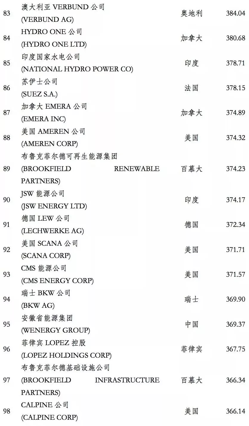 電力企業(yè)全球競(jìng)爭(zhēng)力排行榜100強(qiáng)
